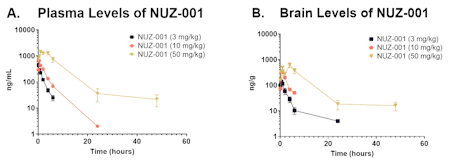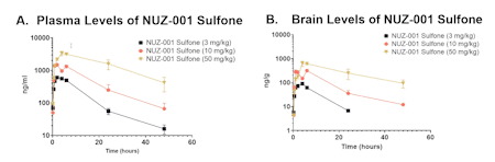 In a rodent PK study, a single administration of NUZ-001 resulted in brain concentrations ranging from 285 to 1,300 nM across dose groups (Maximum brain levels for NUZ-001: 135 ng/g @ 3 mg/kg (285 nM), 335 ng/g @ 10 mg/kg (708 nM) and 616 ng/g @ 50 mg/kg (1,300 nM) with an average brain to plasma ratio of 0.47 across dose levels. NUZ-001 Sulfone reached brain levels of 177 to 1,231 nM (Maximum brain levels for NUZ-001 Sulfone: 89 ng/g @ 3 mg/kg (177 nM), 312 ng/g @ 10 mg/kg (617 nM) and 622 ng/g @ 50 mg/kg (1,231 nM) with an average brain to plasma ratio of 0.13 across dose groups (Figures 1 and 2).