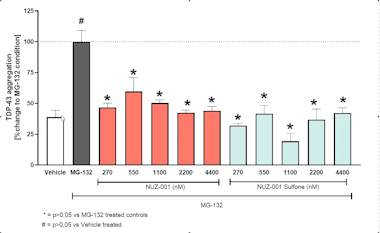 The ability of NUZ-001 and NUZ-001 Sulfone to reduce TDP-43 aggregation in M337V Motor Neurons co-cultured with astrocytes was evaluated in response to a proteasomal stressor (MG-132). TDP-43 is a known driver of ALS pathology. The results (Figure 3) show that NUZ-001 and NUZ-001 Sulfone significantly prevented (p = <0.05) the aggregation of TDP-43 in M337V Motor Neurons treated simultaneously with the proteasomal stressor at all concentrations tested (270–4,400 nM).